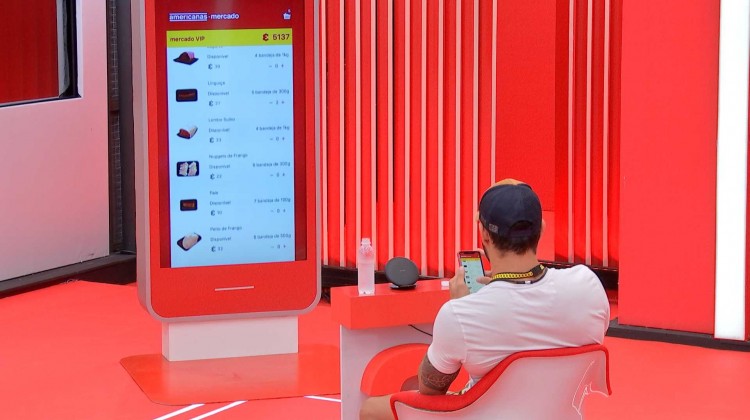 Os participantes do grupo VIP se reúnem na sala e, em seguida, sobem para o segundo andar da casa do BBB21 para fazer as compras da semana no Mercado Americanas.